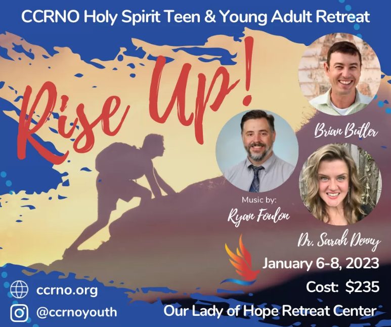 Ministry with Alex Lorio, Lydia Dufresne, Timmy McCaffery, and the CCRNO Team! Fr. Mark Beard to celebrate Mass and Preach! More Speaker Info Coming Soon!