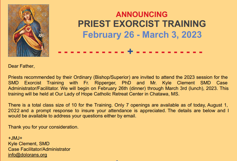 Monte Christo Priest Exorcist Training Sunday, February 26, 2023 1:30 PM 13:30 Thursday, March 2, 2023 2:30 PM 14:30 Google Calendar ICS Click on the flyer for more information. Please register at https://montechristo.net/training/