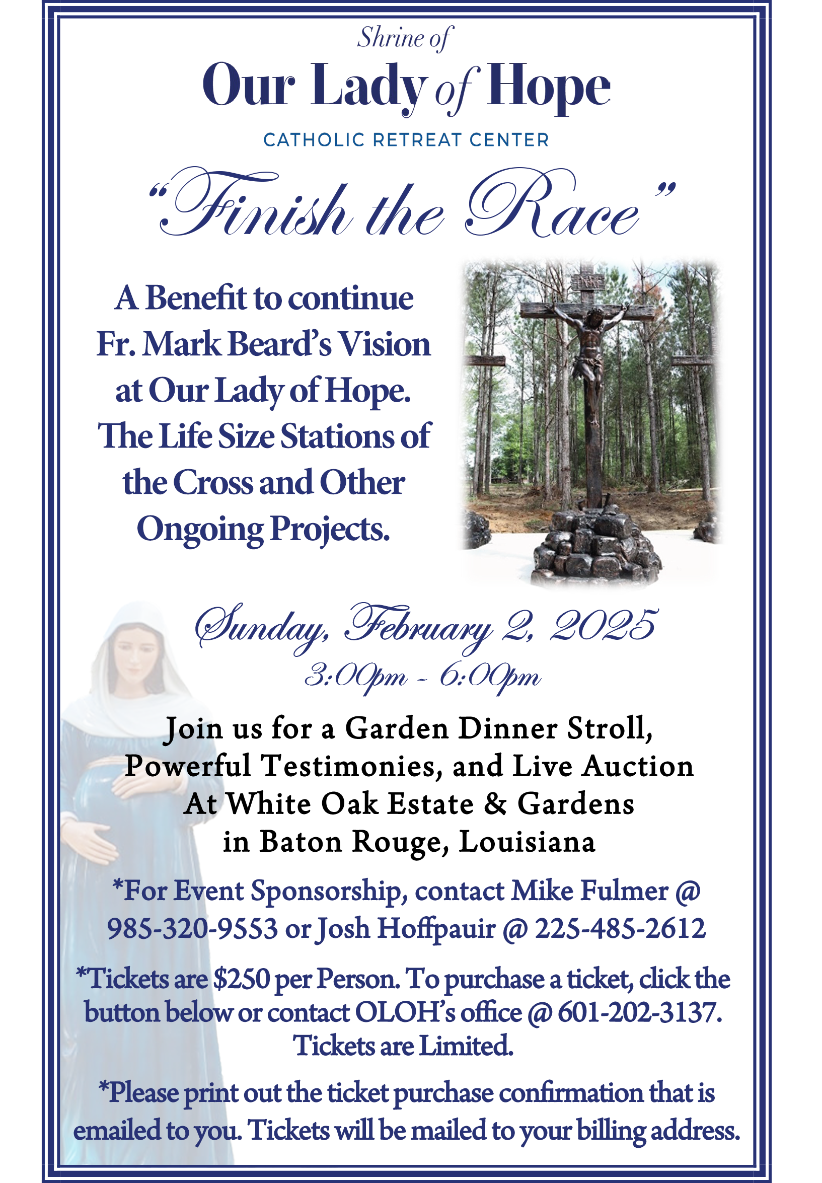Thank you so much for wanting to support Fr. Mark’s Vision at Our Lady of Hope. We are very grateful by the show of support to help “Finish the Race,” and if the White Oak Estates and Gardens could accommodate additional guests, we would make it available. We sincerely hope that you will join us next year!