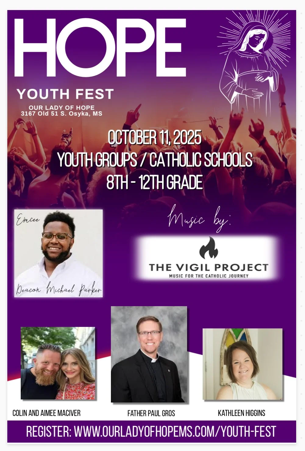 Pope Francis officially declared 2025 a Year of Jubilee with the theme “Hope Does Not Disappoint.” Putting our focus on HOPE and relying on the intercession of Our Lady of Hope, we would like to invite you to save the date for what we trust will be a beautiful event. Hope Youth Fest is set to take place at Our Lady of Hope Catholic Retreat Center in Chatawa, Mississippi on Saturday, October 11, 2025. This one-day event will bring thousands of high school teens from the surrounding areas together to celebrate and encounter the Catholic faith. The day promises to ignite our hearts with music from The Vigil Project, along with talks and entertainment from Colin and Aimee MacIver, Kathleen Higgins, and Fr. Paul Gros. If that is not already exciting enough, the day will be emceed by Deacon Michael Parker! We will have confessions available, as well as adoration and will celebrate holy mass before Vigil Project takes the stage for praise and worship. The day is jam packed with content to welcome our youth into discovering their own identity within the Catholic faith. Please share it with the high schools, churches, and youth directors of your parish. Below you will find the mission statement for Hope Youth Fest.